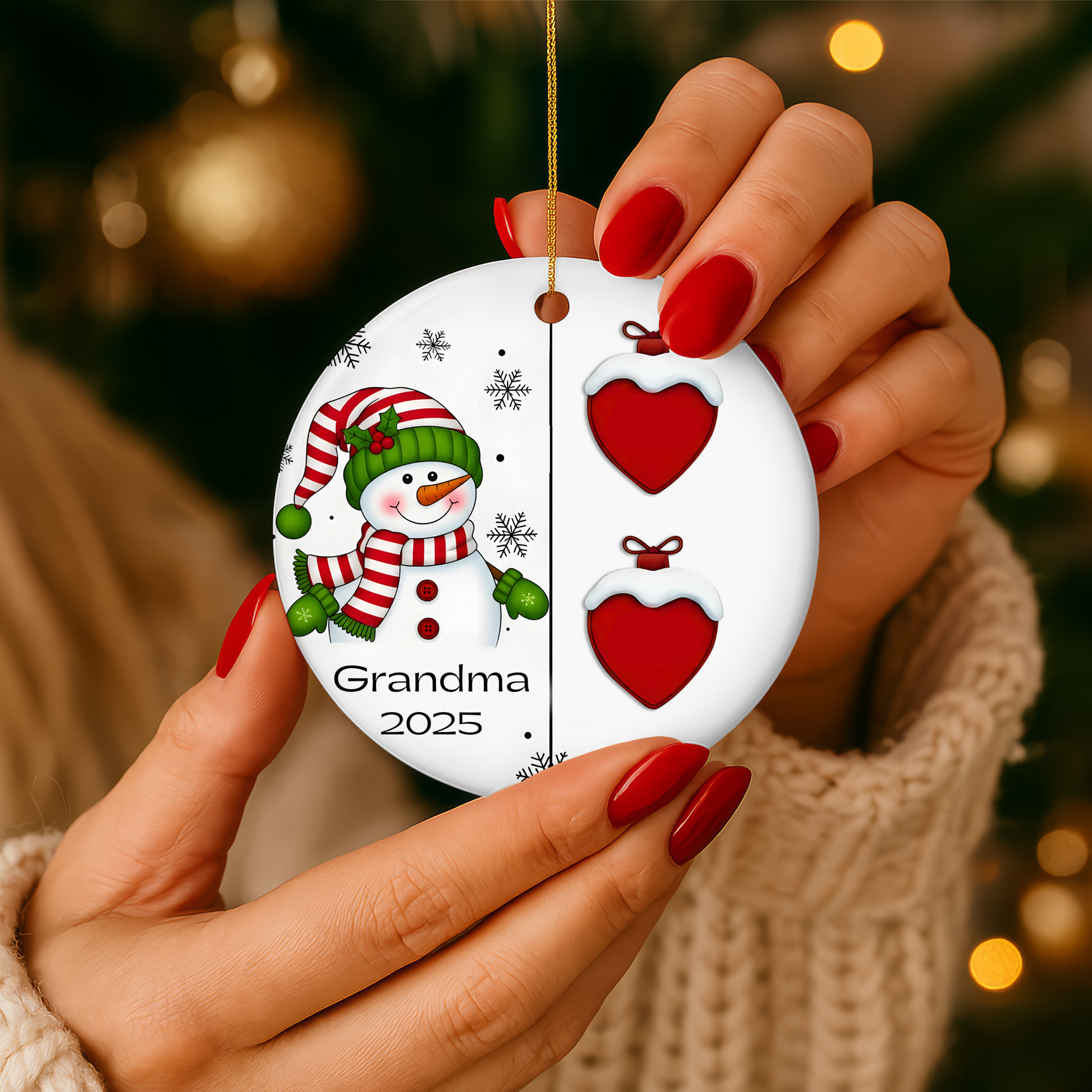 Celebrate the magic of the season with this whimsical double sided snowman/woman ornament, lovingly designed with a heart for each grandchild! Perfect for proud grandmas and family-loving holiday decorators, this charming keepsake brings joy to any Christmas tree.